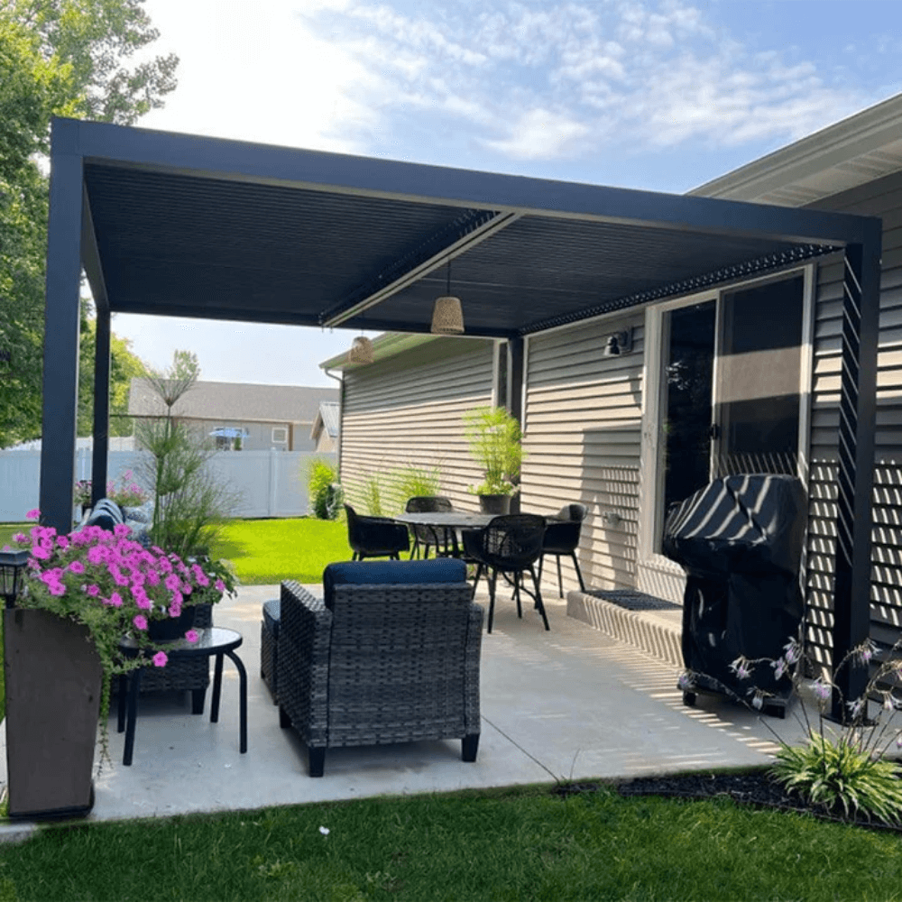 - “This pergola transformed my back patio into a stylish, functional retreat! The independent louvered roof lets me control sun, shade, and ventilation effortlessly!”