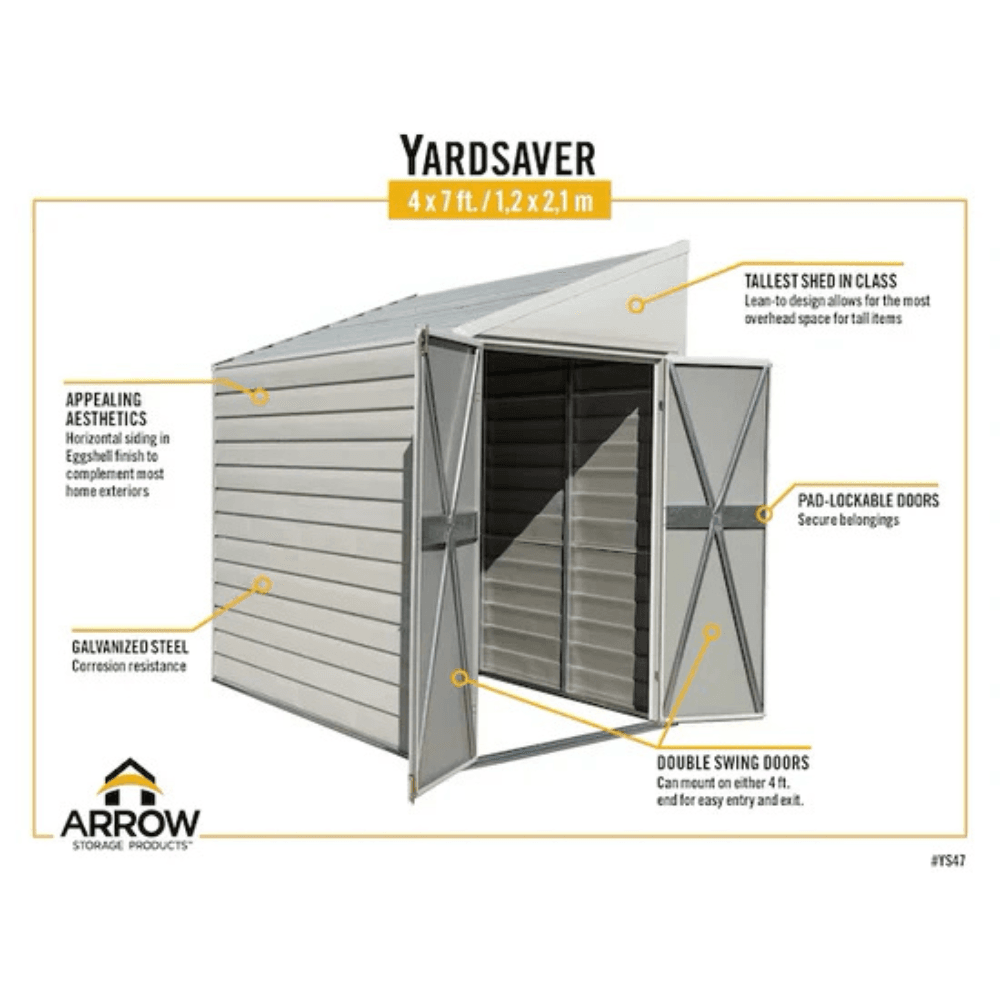 The Arrow 4 ft. x 7 ft. Yardsaver Galvanized Steel Storage Shed is a compact, durable, and practical solution for organizing outdoor essentials. Its space-saving design, sturdy construction, and low-maintenance features make it a valuable addition to any outdoor space. Whether you need to store gardening tools, bicycles, or seasonal equipment, this shed offers a reliable and efficient storage option.