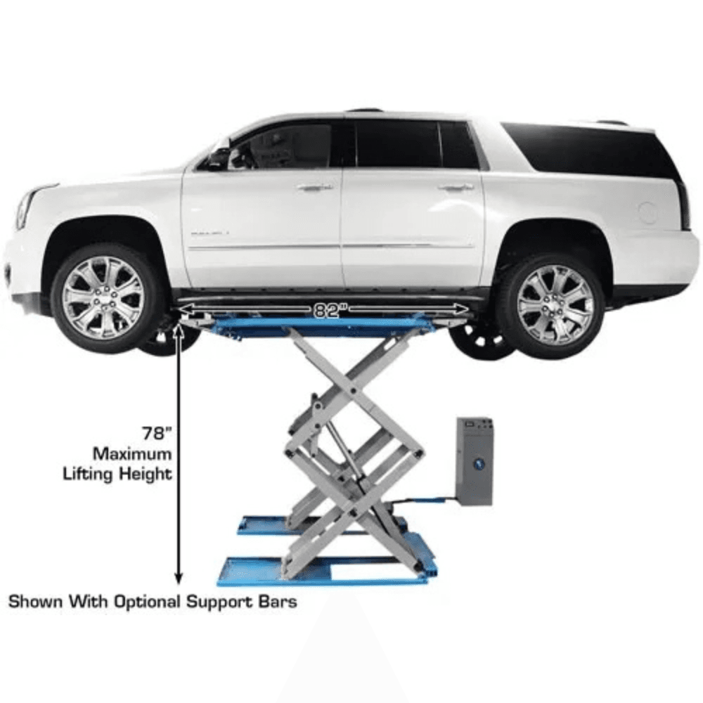 - Full-Rise Scissor Lift (78” Max Height) – Provides ample clearance for undercar repairs, wheel service, and maintenance.