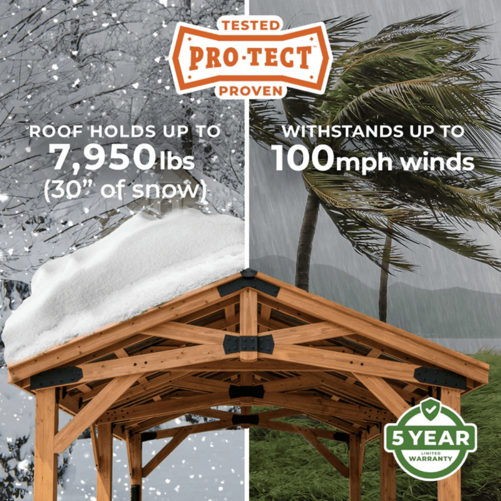 Transform your outdoor space with the Backyard Discovery 12′ x 12′ Arlington Gazebo, designed for superior durability, elegant aesthetics, and ultimate functionality. Crafted from 100% premium cedar wood, this PRO-TECT Tested & Proven structure is built to withstand heavy snow loads, strong winds, and year-round outdoor use. Featuring a heavy-duty steel roof, reinforced anchoring system, and built-in PowerPort, this gazebo provides the perfect blend of protection, convenience, and style for your backyard, patio, or garden.