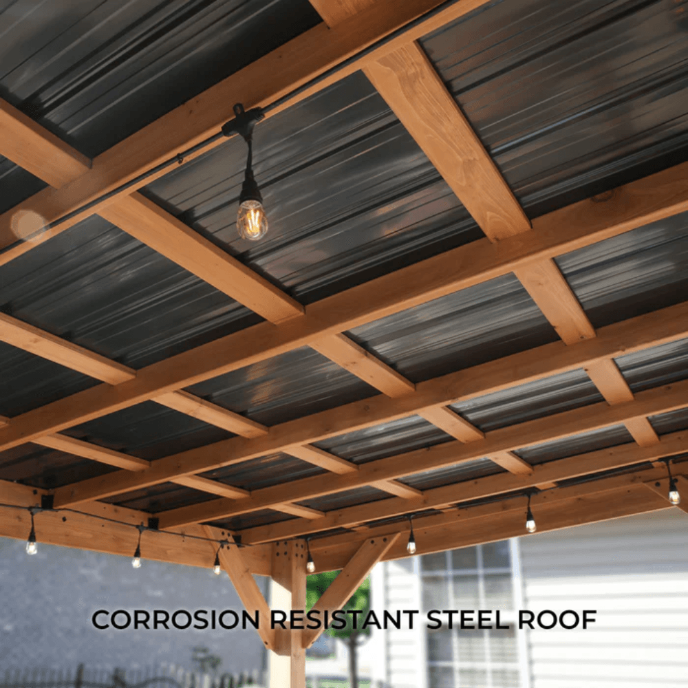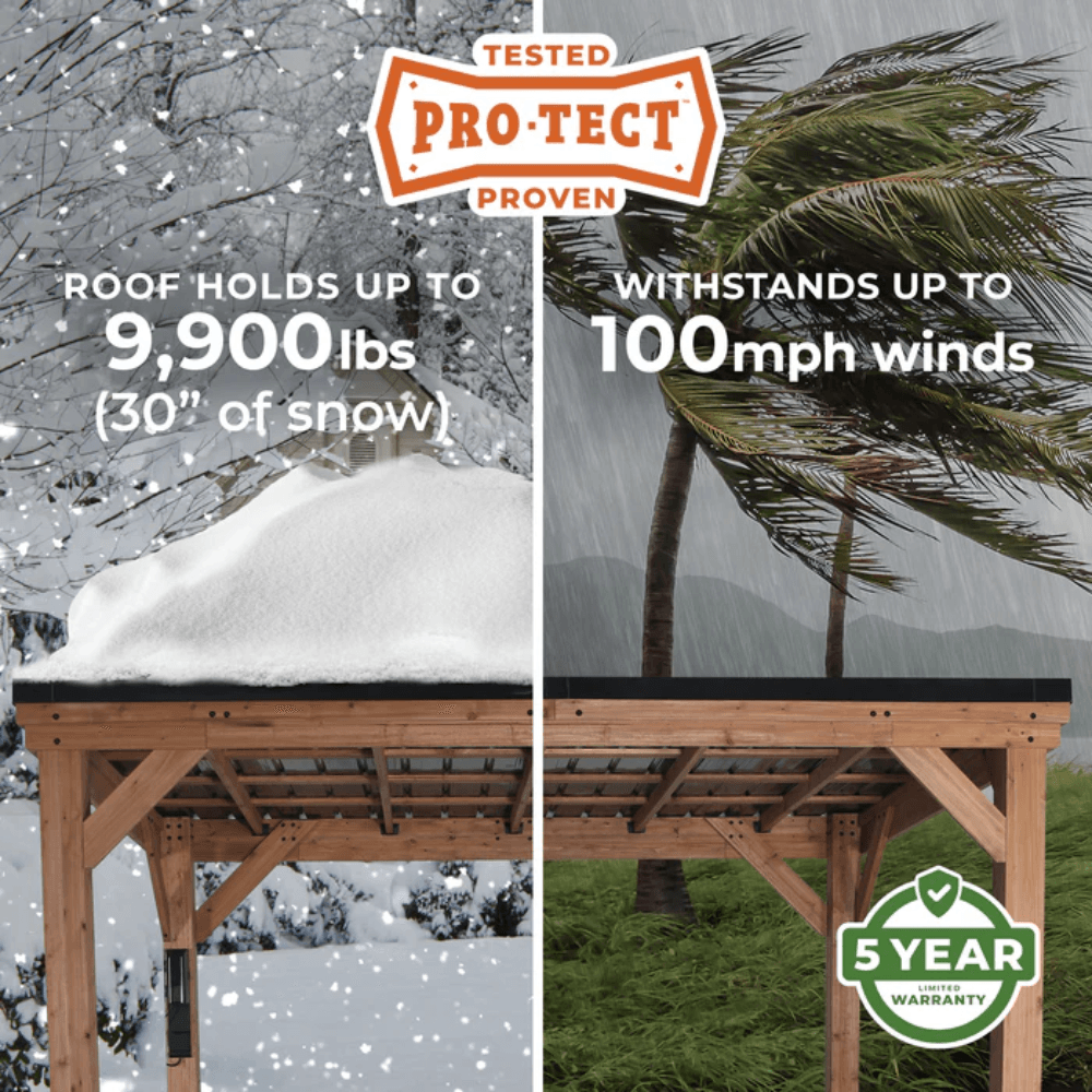 Enhance your outdoor space with the Backyard Discovery 20′ x 9.5′ Arcadia Slope Roof Gazebo, designed for versatile functionality, superior durability, and modern aesthetics. Whether used as a spacious pavilion for entertaining or a protective structure for outdoor equipment, this PRO-TECT™ Tested & Proven gazebo provides year-round reliability. Featuring a heavy-duty steel roof, solid cedar wood posts, and built-in PowerPort™, this gazebo is a perfect blend of strength, style, and functionality.
