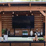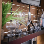 - Spacious steel shelving keeps bar essentials, glassware, and drinks organized.