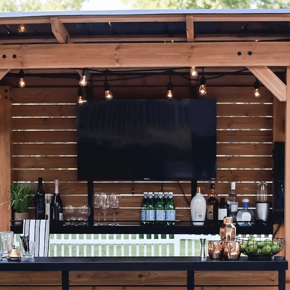 Upgrade your outdoor entertaining space with the Cedar Springs Bar from Backyard Discovery. Crafted from 100% premium cedar wood, this durable and stylish outdoor bar provides the perfect setting for hosting gatherings, mixing drinks, or simply relaxing in your backyard. With steel bar tops, built-in storage, and a privacy wall for mounting a TV, this bar is designed to elevate your outdoor living experience.