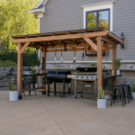 If your outdoor lifestyle revolves around grilling, entertaining, and making memories, the Backyard Discovery Saxony XL Grill Gazebo is the perfect addition to your patio or deck. Crafted from 100% durable cedar wood, this pro-grade structure features a weather-resistant black steel roof, built-in countertops, and an integrated PowerPort™ to enhance your grilling and dining experience. With ample space for multiple grills, smokers, or griddles, the Saxony XL ensures functionality, style, and durability for year-round outdoor cooking.