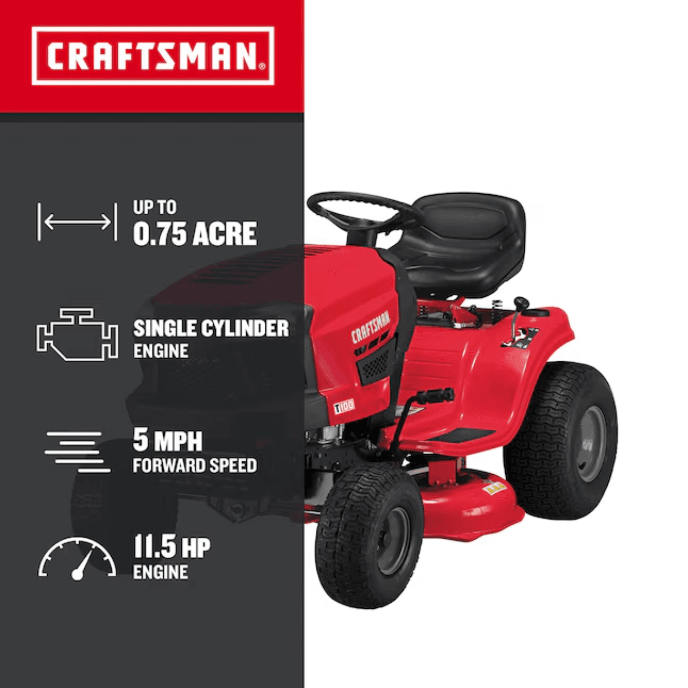 The CRAFTSMAN® T100 is built for homeowners seeking reliable performance, durability, and ease of use. Powered by a robust 11.5 HP Briggs & Stratton® single-cylinder engine, this front-engine riding mower is designed to handle tough jobs while offering a comfortable, easy-to-operate experience.