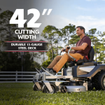 The wide 42-inch cutting deck is designed for maximum efficiency, allowing you to cover large areas quickly while delivering a uniform, clean cut. Its precision engineering ensures optimal grass lift and discharge, reducing the need for frequent passes. - Zero-Turn Capability:
