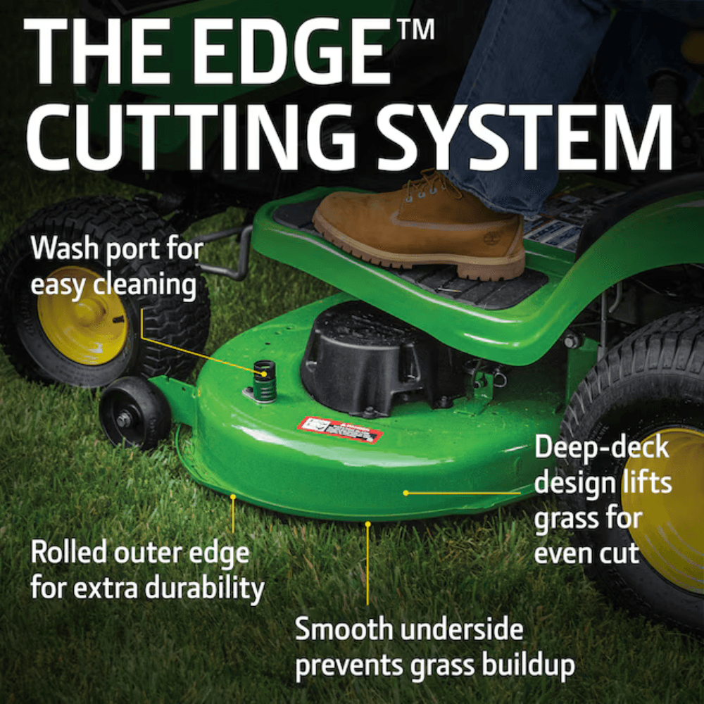 - The 42-inch Edge Mower Deck is engineered for a deep, even cut with a smooth underside that minimizes grass buildup.