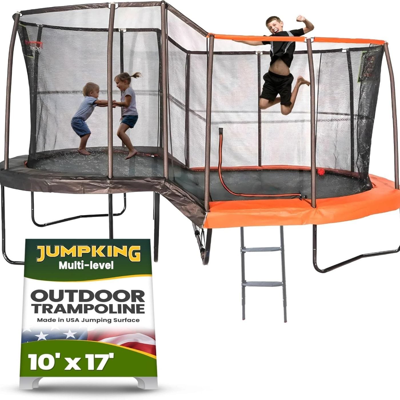 - MULTI-LEVEL DESIGN FOR DYNAMIC BOUNCING: Discover the joy of jumping with our 10’ x 17’ oval trampoline featuring a unique multi-level design. With two different heights, this trampoline offers zones for various skill levels, making it perfect for kids and adults. The heavy-duty welded T-connector ensures stability and long-lasting fun for everyone.Made in USA jumping surface constructed of UV protected polypropylene with airflow that provides for a better bounce as compared with other materials.