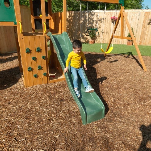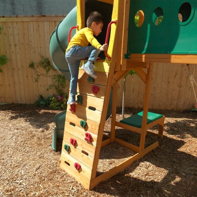 The Mockingbird View Playset by KidKraft is packed full of exciting play options and big enough for the whole neighborhood gang to explore Designed to accommodate lots of energetic little ones, this playset features a spacious lookout tower with a telescope, an adventure tower with a shaded canopy and an activity center with a bag toss and basketball hoop. Kids are invited to enjoy thrilling rides down the 12-foot twist-n-ride tube slide or the high rail wave slide. They’ll learn to participate in cooperative play as they take turns crawling through the 6-foot tunnel that connects the two towers. Promote confidence and independence in kiddos as they climb the vertical rock wall or swing on the two belt swings. A durable, weather-resistant tire swing offers classic fun while promoting teamwork as kids work together to swing high. After twirling on the acro bar with grips, little ones can get dirty underneath the adventure tower as they build castles in the shaded sandbox—so much fun that even mom and dad might want to join! Little hands will love squishing, splashing and playing with sand, water and more in the interactive station. Built with premium wood and treated with a child-friendly water-based stain, the KidKraft Mockingbird View Playset is designed to be aesthetically beautiful, strong and sturdy so that kids can enjoy this ultimate play destination for years!