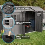 Large 15′ x 8′ storage capacity for organized outdoor storage.
