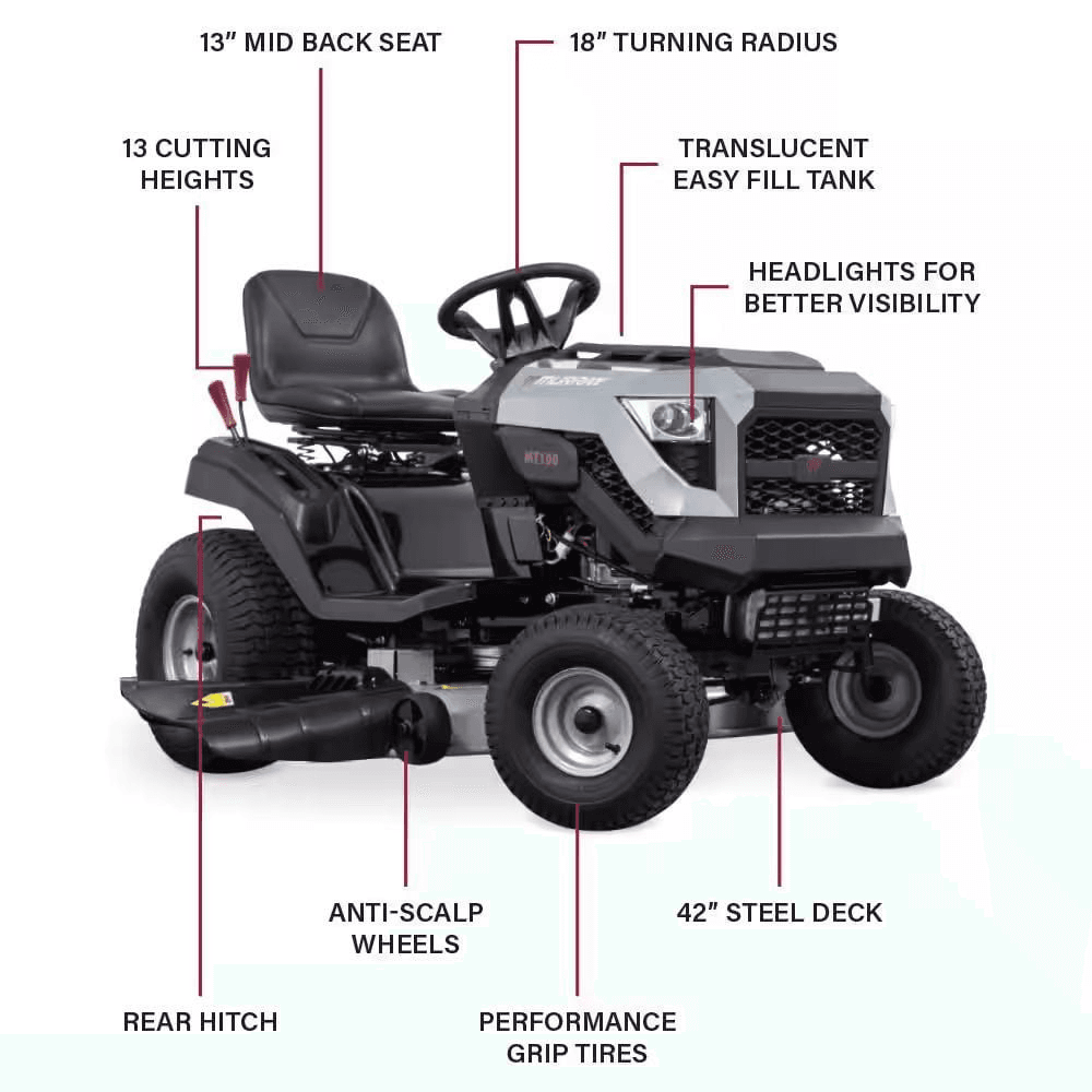 The Murray MT100 42” Riding Lawn Tractor offers efficient cutting, durable performance, and user-friendly operation, making it a great investment for homeowners who want reliable lawn care.