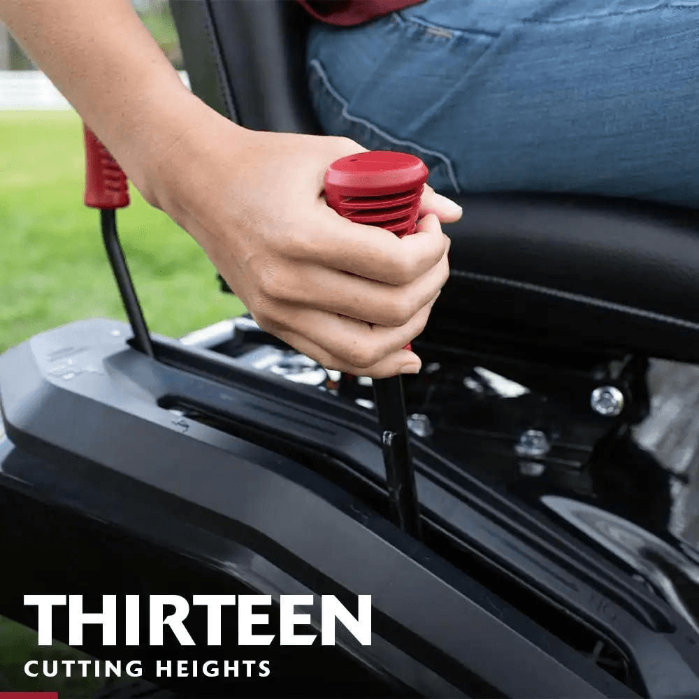 The 42-inch steel cutting deck ensures a clean, even cut with optimized airflow and adjustable height settings.