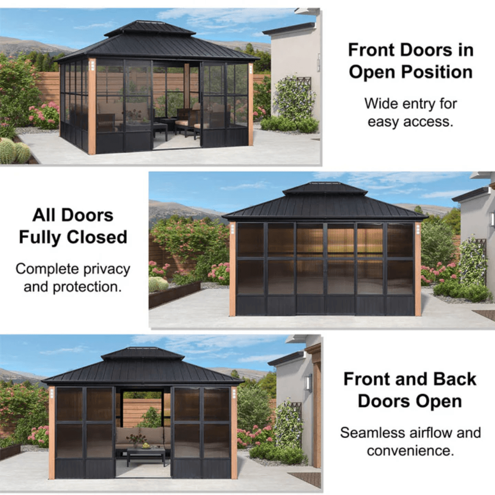 Upgrade your outdoor space with the Wood Grain Sunroom Hardtop Gazebo—a perfect combination of style, protection, and year-round usability!