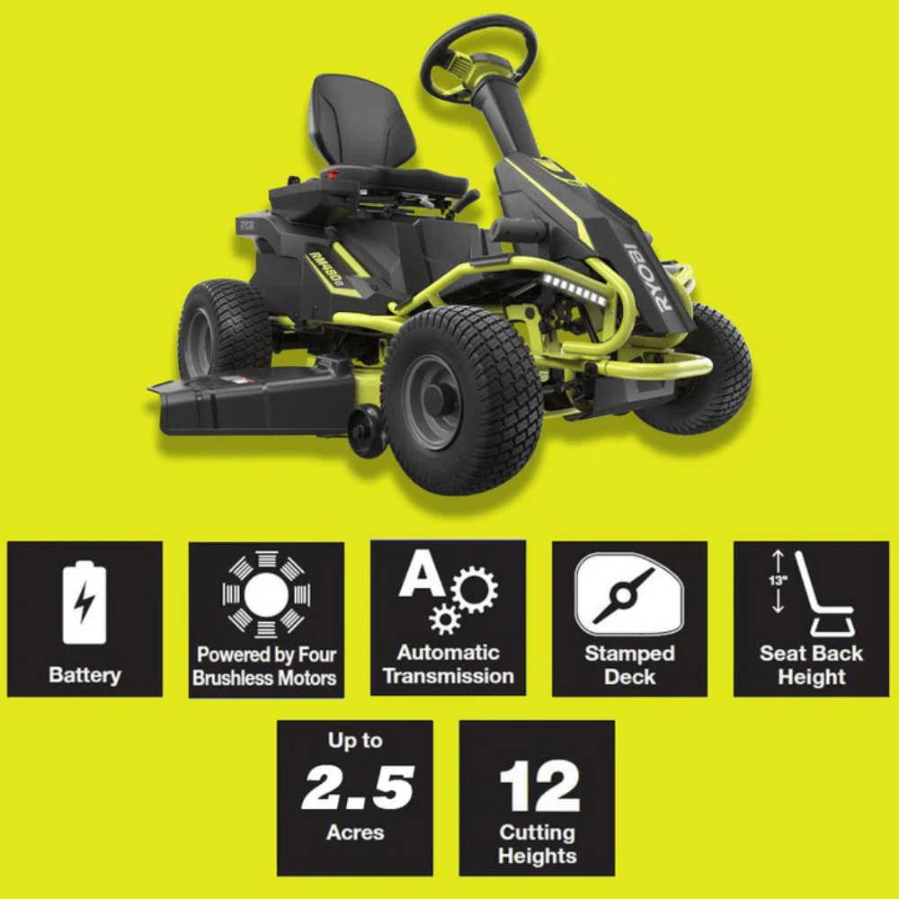 RYOBI 38″ 100 AH BATTERY ELECTRIC REAR ENGINE RIDING LAWN MOWER