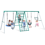 Bring the ultimate adventure to your backyard with this multi-activity swing set, designed to keep kids active and entertained for hours. Featuring a belt swing, a spacious saucer swing, a climbing ladder, a climbing net, and a trapeze bar, this playset offers endless fun and physical challenges that promote balance, coordination, and strength.